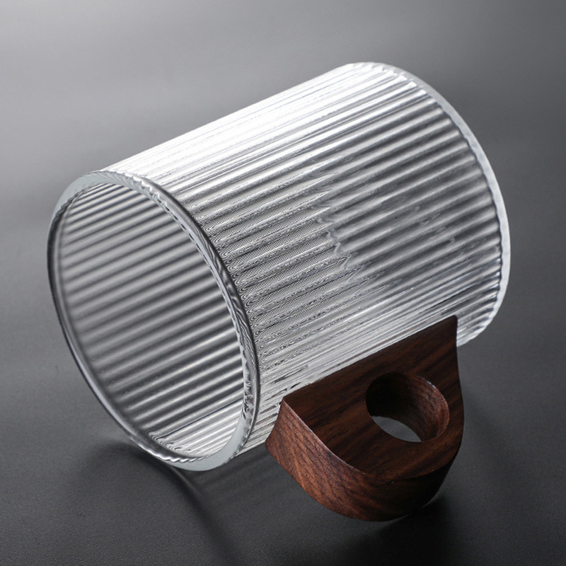 Features: high borosilicate heat-resistant glass; resistance to cold and heat; striped body; rounded mouth; walnut handle