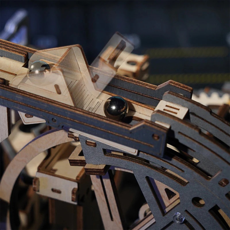 Get ready for a whole new visual feast! This is a marble run model, which is designed in dark gray and dotted with silver. The brand-new product of ROKR Track Maze City, Marble Spaceport (LGC01) was born with the theme of future space technologies. The uniqueness of this marble run lies in its complex mechanical structures, which are 6 diversion mechanisms and 5 tracks. Turning the handle, you can watch steel balls rolling through different tracks. With the highly transparent PC and PS materials, you can clearly observe the movement of each ball. In addition, Marble Spaceport (LGC01) has an upgraded design with two drive modes, which are manual mode and electric mode. Switch between these two modes as you prefer to get more fun.